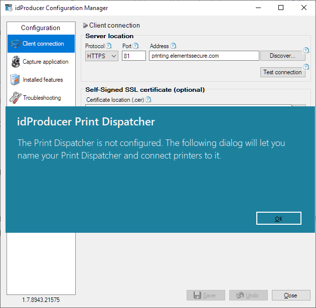 - The idProducer Configuration Manager re-opens with a message reporting the Print Dispatcher configuration is not complete. You need to name the print dispatcher and connect your printers to it.