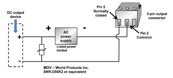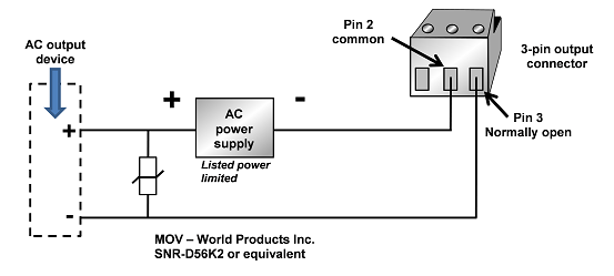 Connect the output wiring to the 3-pin output connector Pin 1 is normally closed (NC). Pin 2 is common. Pin 3 is normally open (NO).