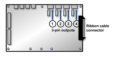 Outputs can be connected either to an access control blade or to an output blade. Access control blades have four 3-pin output connectors mounted on the blade, as shown: