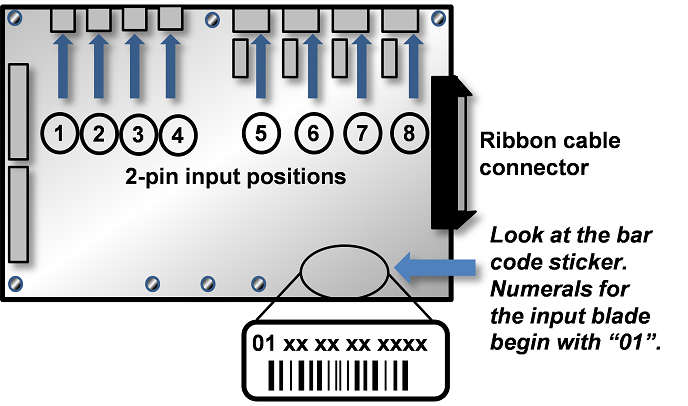 Input blades and temperature blades look very much alike. To tell them apart, look at the bar code sticker on the back of the blade. The numerals on the bar code sticker for an Input blade begin with "01", as shown above. The numerals on the bar code sticker for a Temperature blade begin with "08".