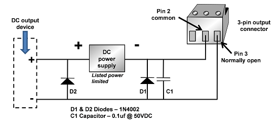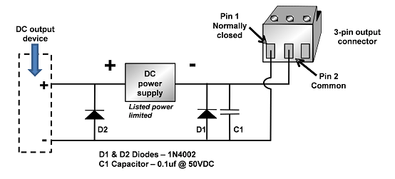 If the output device is DC powered and normally energized, use the circuit shown in the following diagram: