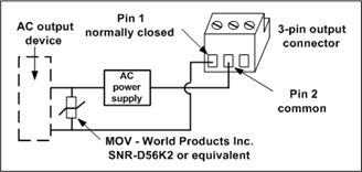 If the output device is AC powered and normally closed, install a varistor (40 VAC, 56 VDC, 10 A Surge, Radial Leaded Varistor or equivalent, such as World Products Inc. SNR-D56K2) in the circuit:
