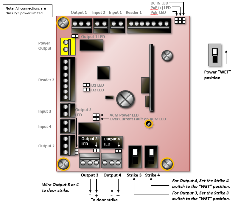 Set the strike switch for that output to the WET position, as shown for Output 3 in the following diagram.
