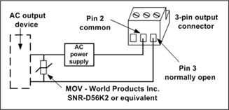 If the output device is AC powered and normally open, install a varistor (40 VAC, 56 VDC, 10 A Surge, Radial Leaded Varistor or equivalent such as World Products Inc. SNR-D56K2) in the circuit: