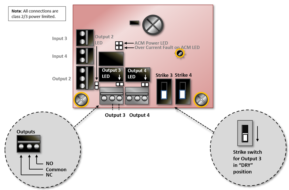 WARNING: If Output 3 or 4 is selected you must set the strike switch to the DRY position. Otherwise, power will be delivered to the output device. The following diagram shows Output 3 and its strike switch, Strike 3 set to DRY.