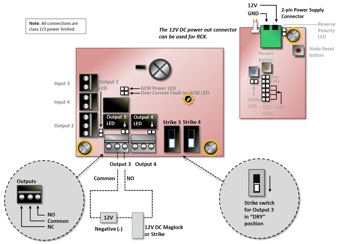 Any output can be used to power a 12V or 24V door strike or magnetic lock (maximum electrical rating: 2.5 Amps with an inductive load). If Output 3 or 4 is selected, the strike switch must be set to the DRY position, as shown for Output 3 in the following diagram, for it to use an external power source.