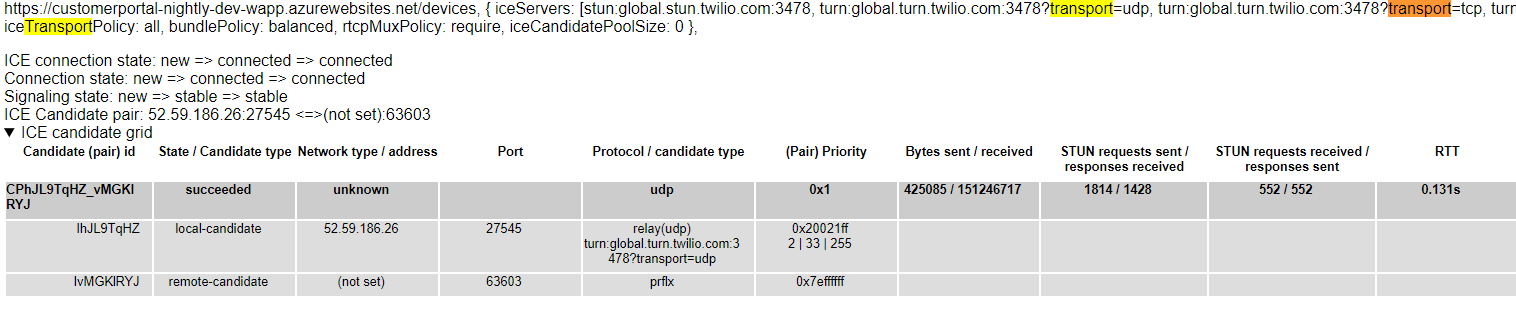 - ICE Candidates/ICE candidate grid: Lists the candidate IP addresses and ports discovered for your connection.