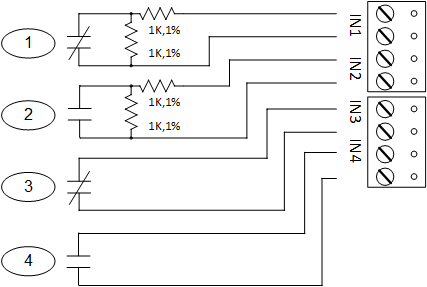 These inputs are connected using the IN1, IN2, IN3, IN4, IN5, IN6, IN7, and IN8 inputs. The standard wiring configuration is as follows: