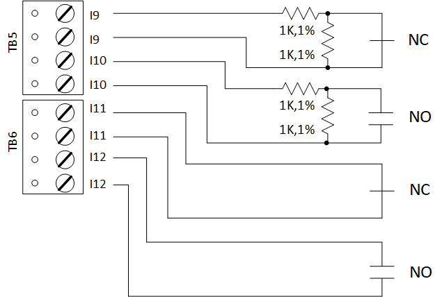 Inputs 1 to 16 can be configured to use or not use End Of Line (EOL) resistors and to use normally open or normally closed contacts. Input CT and input BA are used for monitoring cabinet tamper and power failure, respectively. These two (2) inputs are for contact closure monitoring only, and do not use EOL resistors.