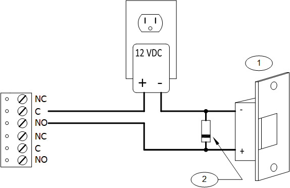 Two (2) form-C contact relays are provided for controlling door strikes or other devices. Load switching can cause abnormal contact wear and premature contact failure. Switching of inductive loads (strike) also causes EMI (electromagnetic interference) which may interfere with normal operation of other equipment. To minimize premature contact failure and to increase system reliability, a contact protection circuit must be used. The following two (2) circuits are recommended. Locate the protection circuit as close to the load as possible (within 12 inches [30cm]) as the effectiveness of the circuit will decrease if it is located farther away.