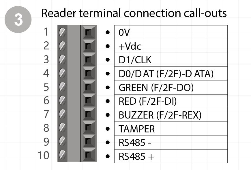- Refer to the appropriate reader interface wiring diagram and use the reader terminal connection call-outs in the following chart to connect the reader. Refer to Wiring Readers.