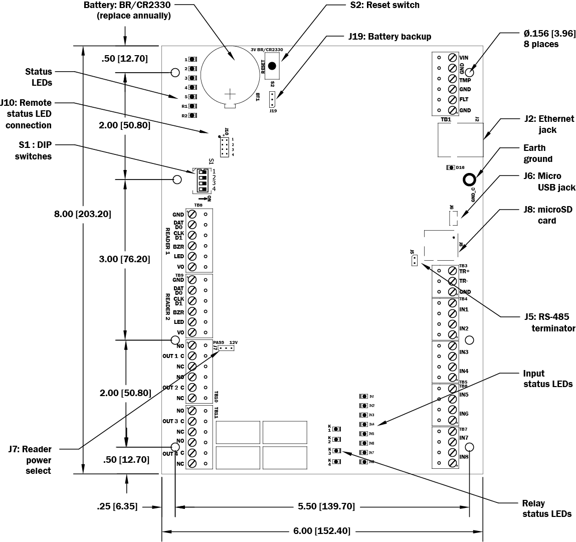 - Power (jumper selectable): 12 VDC ± 10% regulated, 300 mA maximum each reader (input voltage (VIN) must be greater than 20 VDC) or