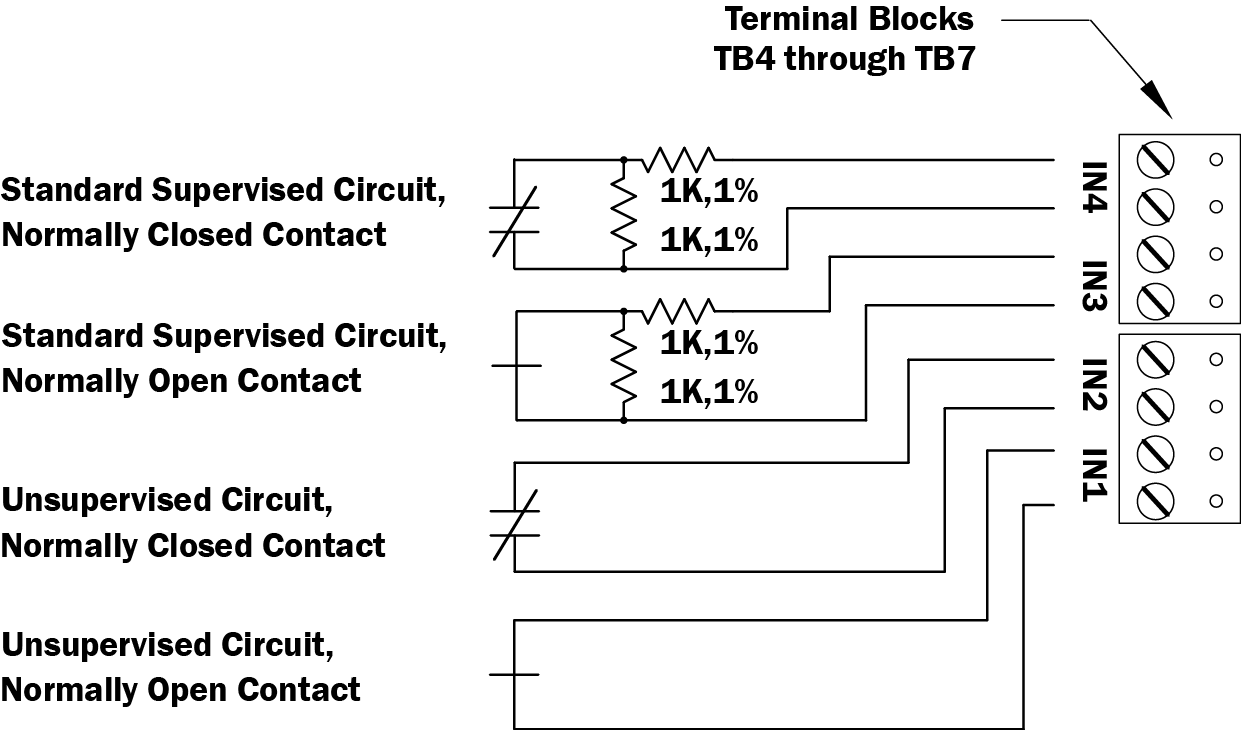 There are 8 inputs that are typically used to monitor door position, request to exit, or alarm contacts. Input circuits can be configured as unsupervised or supervised. When unsupervised, reporting consists of only the open or closed states. When configured as supervised, the input circuit will report not only open and closed, but also open circuit, shorted, grounded, and foreign voltage. A supervised input circuit requires two resistors be added to the circuit to facilitate proper reporting. The standard supervised circuit requires 1k ohm, 1% resistors and should be located as close to the sensor as possible. Custom end of line (EOL) resistances may be configured via the host software.