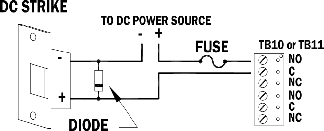 Door lock mechanisms can generate feedback to the relay circuit that can cause damage and premature failure of the relay plus affect the operation of the LNL-X2220. For this reason, it is recommended that a diode be used to protect the relay. Wire should be of sufficient gauge to avoid voltage loss.