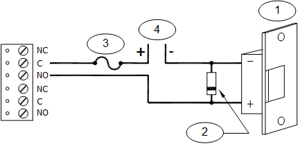 16 Form-C contact relays are provided for controlling door strikes or other devices. Load switching can cause abnormal contact wear and premature contact failure. Switching of inductive loads (strike) also causes EMI (electromagnetic interference) which may interfere with normal operation of other equipment. To minimize premature contact failure and to increase system reliability, a contact protection circuit must be used. The following two (2) circuits are recommended. Locate the protection circuit as close to the load as possible (within 12 inches [30 cm]), as the effectiveness of the circuit will decrease if it is located farther away.