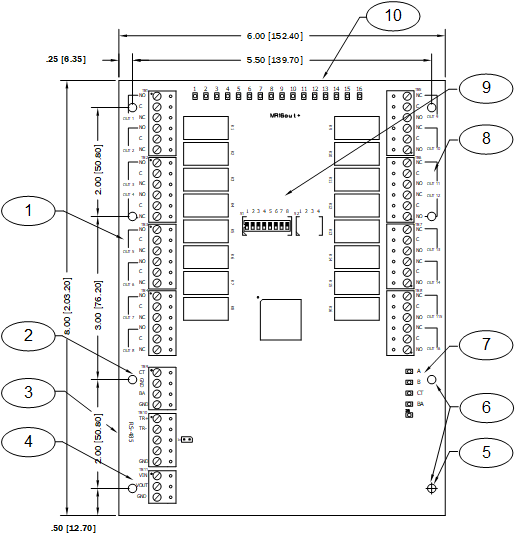 LED 1 through 16: Illuminate when output relay OUT 1 (K1), OUT 2 (K2) is energized and so on.