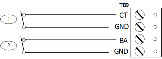 Input CT and input BA are used for monitoring cabinet tamper and power failure with normally closed contacts. These two (2) inputs are for contact closure monitoring only, and do not use EOL resistor(s). If these inputs are not used, install a short piece of wire at the input to indicate a safe condition.