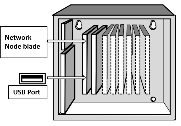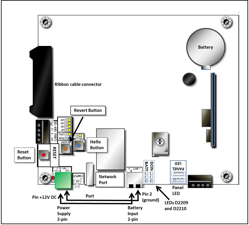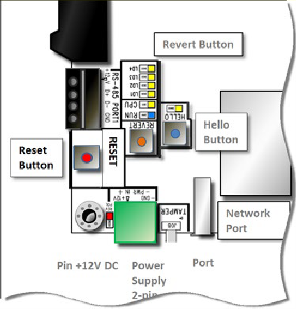 The Hello button is located near the Tamper Switch connector. | Pressing the Hello button sends a "Hello" indication to the Network Node's embedded web server. This identification stays active for two minutes. If a USB flash drive is plugged in to the Network Node’s USB connector, (after waiting about 5 seconds for it to be recognized) the system will write its network configuration to or from the flash drive. |