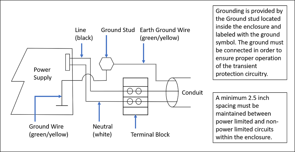 A minimum 14 AWG (2.5 mm2) earthing conductor must also be provided and connected to the earth stud as indicated in the wiring diagram.