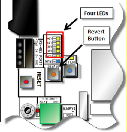The Revert button is located near the green Power connector and the column of LEDs. | When you hold down the Revert button for at least 10 seconds, the four LEDs next to the button start to light up and then begin blinking on and off. Once all four buttons are blinking on and off at the same time, release the button and the revert will occur, returning the Network Node to its factory default settings: